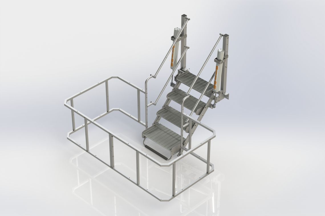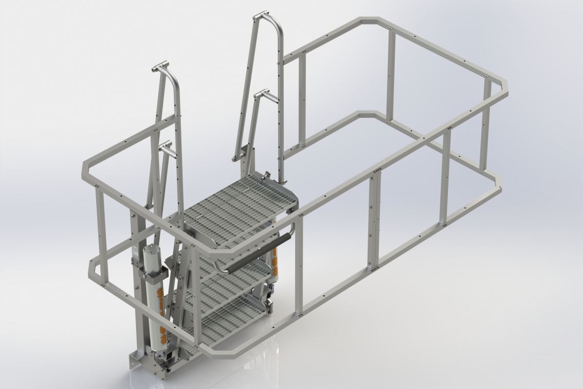Folding Stair is designed to allow access from the platform to the manholes of tank trucks and rail-wagons. The stairs automatically adjust to the height of the tank and can be designed with 3, 4 or 5 steps, with or without safety cage.